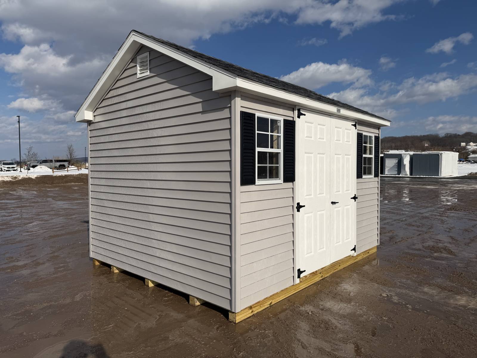 3/4" Fire Retardant Pressure Treated Floor System 12" O.C., 7' Wall Height, Solid Core Fiberglass Doors, 6" Overhangs, 30 Year Architectural Shingles, 10 Year Warranty